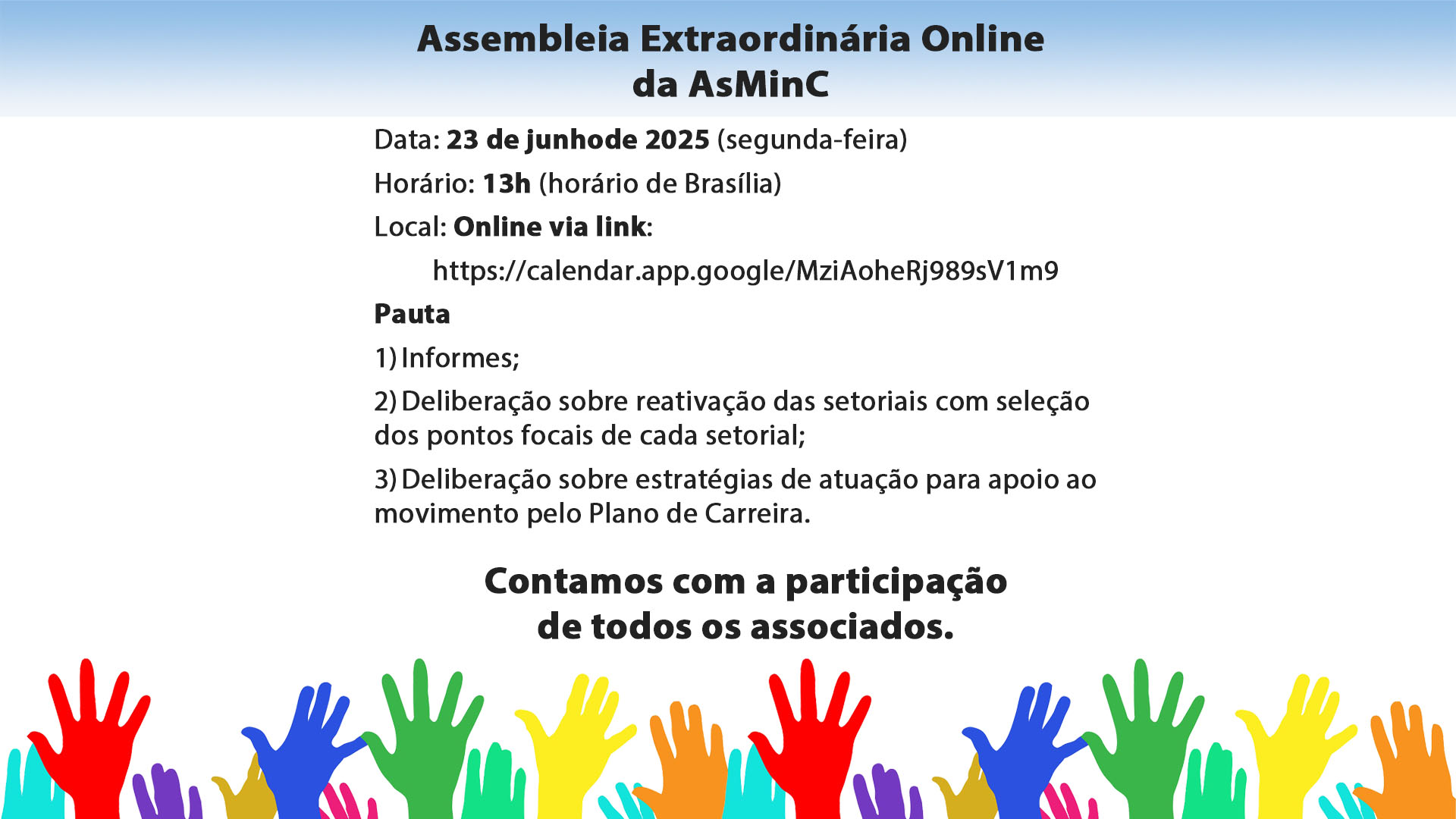 A Diretoria da AsMinC convoca seus associados para participarem da Assembleia Geral Extraordinária, a realizar-se no dia 23 de junho